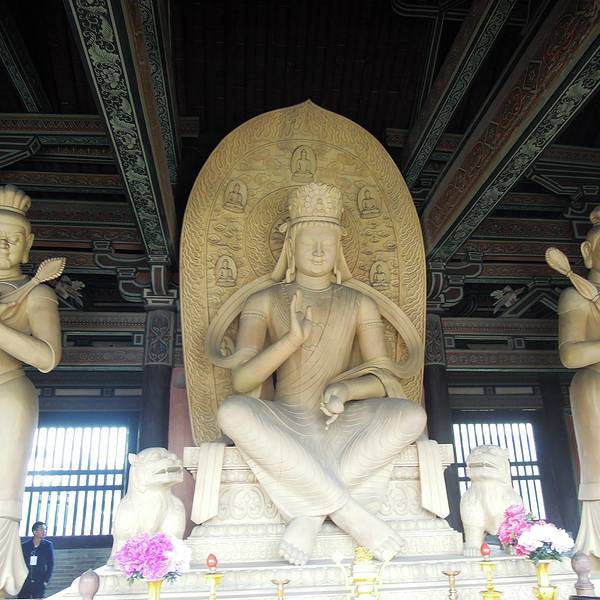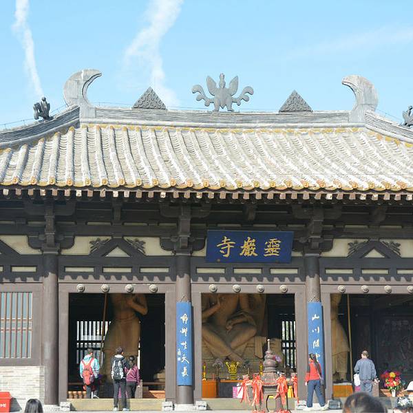 灵岩寺坐落于云冈石窟大景区占地16000余平米的湖心岛中央,总建筑面积6815.8平方米。游客走过张灯结彩的昙曜广场,再穿越古朴典雅的七孔桥,高大的寺院山门就出现在面前。整个寺院为三进院落,除了山门以外,还有作为中殿的“千佛殿”和作为后殿的“大雄宝殿”。 灵岩寺三座大殿的主佛像,全部采用巨大的香樟木作材料,由来自福建省莆田的木雕世家传人黄文寿大师担纲雕刻。其中,山门内的主佛为3尊,中间为交脚弥勒菩萨,两侧为护法;千佛殿的主佛为7尊,中间为释迦牟尼佛,左右还有燃灯佛、多宝佛、观世音、大势至菩萨等;大雄宝殿主像为过去、现在、未来三世佛。湖上的山堂水殿阁楼巍峨,显示了当年皇家寺院的恢弘气派。