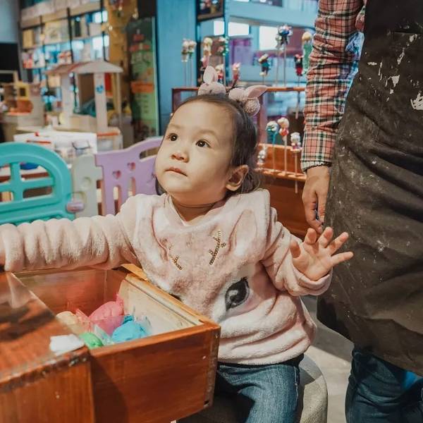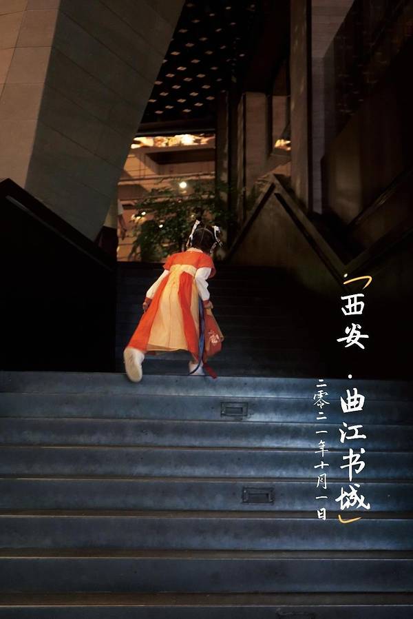 在西安,相对小众又适合带小朋友来的,非曲江书城不可了,刚好我们在西安的几天天气不是特别好。当外面下起毛毛小雨,我们就赶紧躲进曲江书城。它就在大唐芙蓉园的边上,共四层,里面隐藏的有趣东西非常多,不仅文艺还好玩~这里的每一处都精心布置过,特别是上面的古文字特别有西安古都的味道,细节设计得开阔大气。曲江书城顶着西安最大的书城名号,汇集了整整12万的图书种类,真是深度书虫的好去处,一层是旅游和美学的浅阅读,二层是文学类的深度阅读,三层则是亲子体验活动区域。全网最爱旅拍夫妻档应该非我们莫属。没想到在线条硬朗的楼梯处,竟然也是书店最好出片的一处。这里拍照真的拍出了站在天桥上霓虹灯的感觉。四楼儿童区有适合小朋友的捏泥人体验,这是一家创意民俗店,有很多可爱的泥人模型,眼尖的妈妈如我一下子就发现了,马上安排爱莉玩起。果然是解放爸妈双手的好地方。一对一的服务,爱莉在这里跟着老师玩了很久,不仅可以锻炼小朋友的精细动作。还有训练她的专注力。不慌不忙又被安排上了一节“早教课”的爱莉,虽然成品不是非常精细可爱。但是志在体验过程,不是嘛?