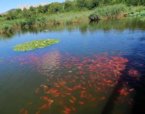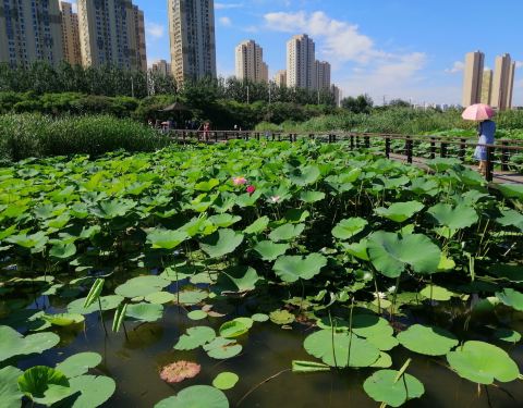 值得一看,很美的地方!从大连火车站坐1路公交车到三道沟换乘42路,在福佳西门下车就到了。城市里的湿地公园,大片的水塘,水塘里有芦苇、有荷花、有野鸭、有金鱼,有木栈道、还有小木船,处处都是好风景,搭帐篷的很多,休闲游玩拍照的好去处。