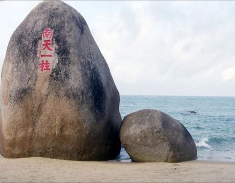 说是南天一柱其实我见到的它特别矮,就是一块石头楚到那,上面刻着南天一柱,距"天涯""海角"二石东走约三百米,正面看像一颗哲人的头颅,侧面看像一艘古船上升起的"双桅帆"。第四版2元人民币背面的图案就是这里的...