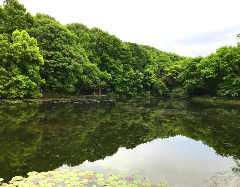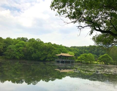 步行前往中山陵游玩的路上路过这里。有一片小湖面,长满莲蓬,荷叶。还有几只小鸟在水面嬉闹着。有一个小亭子可以坐下来纳凉。