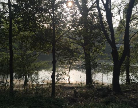 通过孝陵卫站处的绿道入口向里面走路过地震台继续向里面深入能到达流徽榭,有诗意的名字,有诗意的地方,亭台里小憩,看看山看看水看看树木惬意十足。