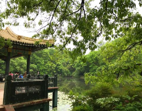 顺着灵谷寺西路一直往里面走。路过地震科学馆,看到一个小小的蓄水池,这时候再往前面看就是流徽榭了。一个小凉亭,一汪清水,散步的人们,惬意十足。