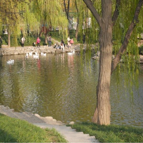 是一个小的人工池,水边杨柳依依,还有很多天鹅,我竟然还看到了黑天鹅,很多游人向它们投食。