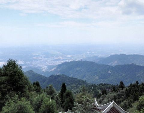 整座山峰像一朵倒置的芙蓉花,芙蓉峰侧有观景台,登台俯临万壑,林木森郁,近者葱茏,远方莽苍,流泉奔泻,有如银练。风景美丽。