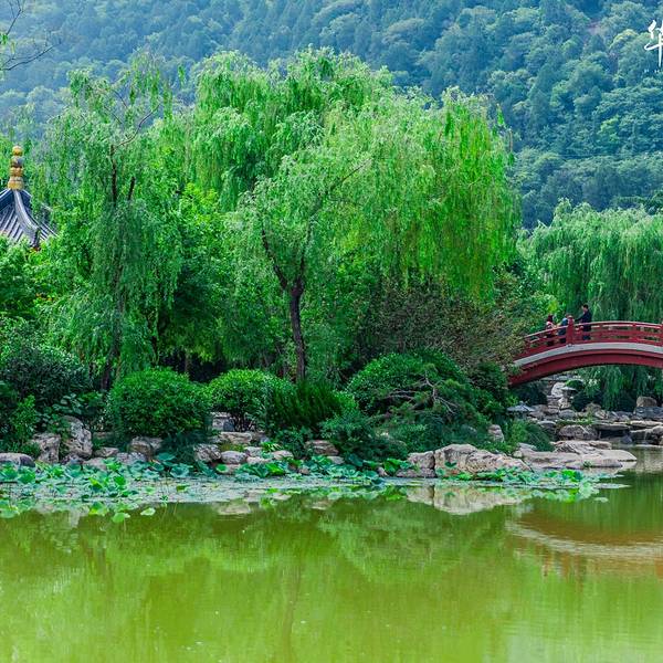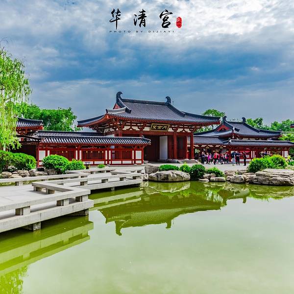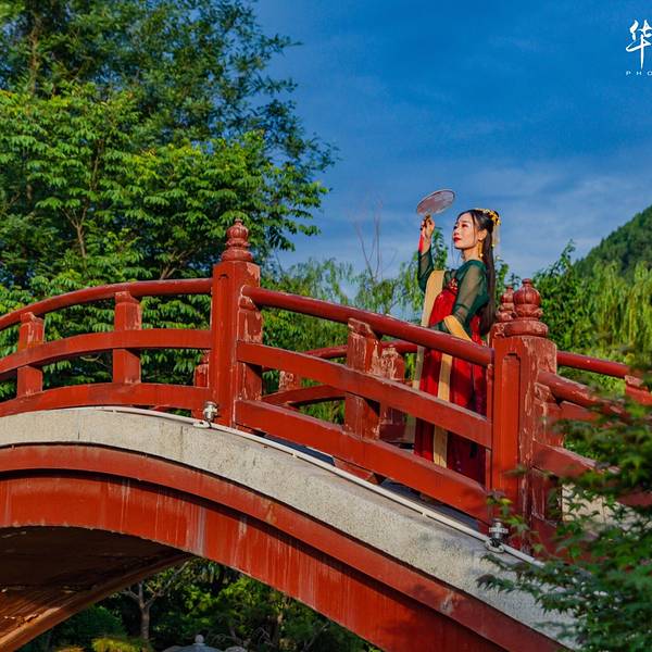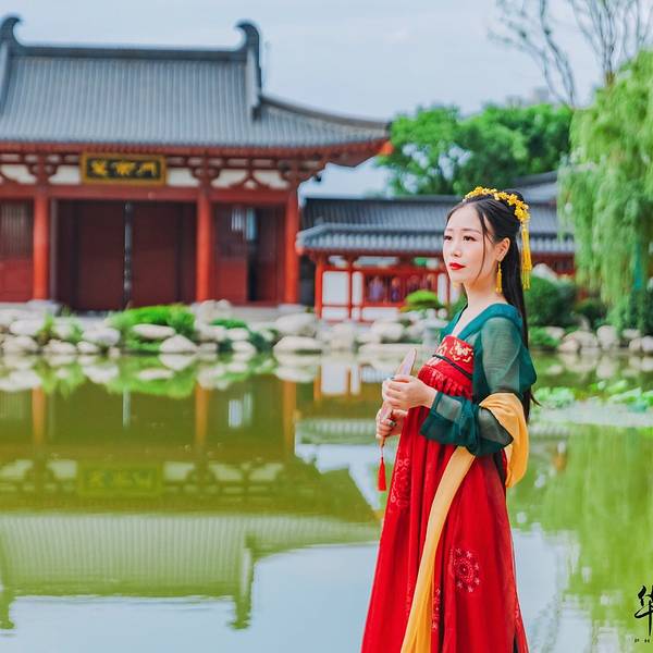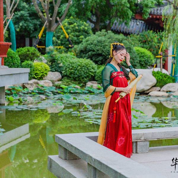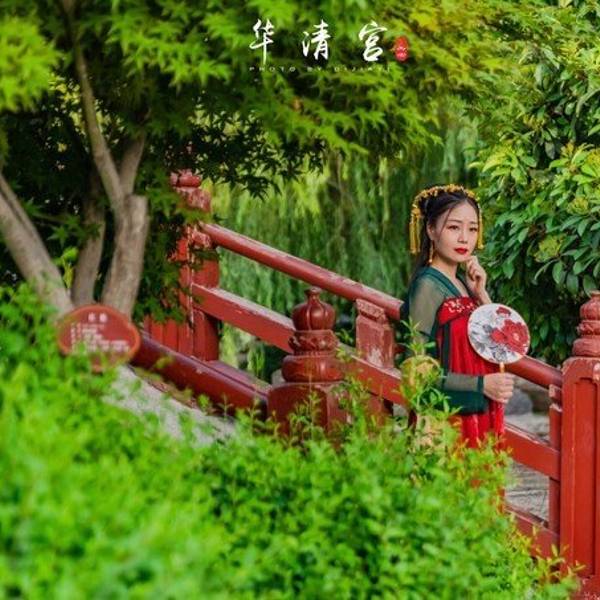 望京门是华清宫的西门,站在此处能远眺到整个芙蓉湖景区,比较遗憾的是来前没有提前预定晚上《长恨歌》的演出,想要的好位置都卖光了,可见这个演出多么受欢迎,大家自己来玩,一定要记得提前购票哦!芙蓉湖对面就是长生殿,两日的行程,我们准备今天先大致逛一下景区,然后明天前往各个博物馆看一看,带来的汉服自然是要拍的,芙蓉湖这边是风景秀美,从这开始游览,可以边走边拍,是个不错的选择。踏入这华丽雍容的庭院,尽管雕梁画栋鲜艳,垂柳繁花茂盛,心里却总想搜寻曲径小桥上纷乱的历史脚步,想窥视飞檐斗拱里隐藏的历史谜底。芙蓉湖旁的芙蓉榭,不知当年 玉环 是否在此处小歇,不觉间李白的诗句涌上心头:云想衣裳花想容, 春风拂槛露华浓。若非群玉山头见,会向瑶台月下逢。当年,李白身处长安,他的心中本有“长风破浪会有时,直挂云帆济沧海”的雄心壮志,却在朝廷中潦倒不得志。一日,唐明皇携爱妃杨 玉环 在沉香亭赏牡丹品美酒,逸兴勃发的唐明皇宣李白为其撰新歌词助兴。酒尽诗出,李白挥笔而成新诗三章。乐师李龟年歌咏,梨园弟子伴奏,连杨贵妃也命人拿来七宝杯,斟满西域葡萄酒,敬于李白,沉香亭内外,牡丹齐放,花香阵阵,歌乐袅袅,一派祥和。在历史上,能得到李白挥洒笔墨的诗篇,唯一一个就是杨 玉环 。而到了现代,《清平调》亦被很多歌手翻唱过,像邓丽君,王菲等,都是乐坛了不起的人物。唐玄宗与杨贵妃,就是在这片山水中寻到了人间的真爱,无论是李白的《清平调》还是白居易的《长恨歌》关于他们的爱情故事,总是那么缠绵悱恻,凄婉动人。