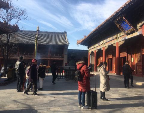 万福阁位于雍和宫内,在阁内供奉着一尊通高26米的白檀香木雕佛像,中外闻名,吸引了很多游客来一睹真容。我们去游览的季节是淡季,但也是人头涌涌,寺庙香火旺盛。