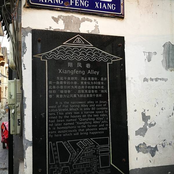 向东向南回到泉城路结束了今天的老街巷游走,这段路的游览时间大概在2小时,如果转的仔细一点要3小时吧济南老街巷中有一条最窄的小巷值得一提,那就是翔凤巷。它东起平泉胡同,西至芙蓉街,宽度仅为80厘米,系由过去两边的墙缝形成,俗称“墙缝巷”,后谐音为“翔凤巷”,取其凤凰来翔之意,街中一间房的墙上,仍嵌...济南老街巷中有一条最窄的小巷值得一提,那就是翔凤巷。它东起平泉胡同,西至芙蓉街,宽度仅为80厘米,系由过去两边的墙缝形成,俗称“墙缝巷”,后谐音为“翔凤巷”,取其凤凰来翔之意,街中一间房的墙上,仍嵌着清咸丰元年“翔凤巷”的刻石。