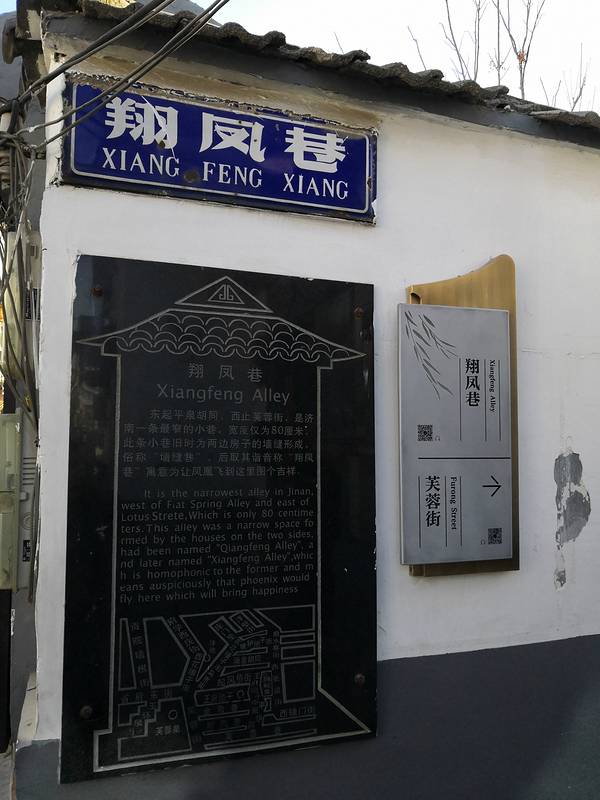 济南老街巷中有一条最窄的小巷值得一提,那就是翔凤巷。它东起平泉胡同,西至芙蓉街,宽度仅为80厘米,系由过去两边的墙缝形成,俗称“墙缝巷”,后谐音为“翔凤巷”,取其凤凰来翔之意,街中一间房的墙上,仍嵌着清咸丰元年“翔凤巷”的刻石。 向东向南回到泉城路结束了今天的老街巷游走,这段路的游览时间大概在2小时,如果转的仔细一点要3小时吧。