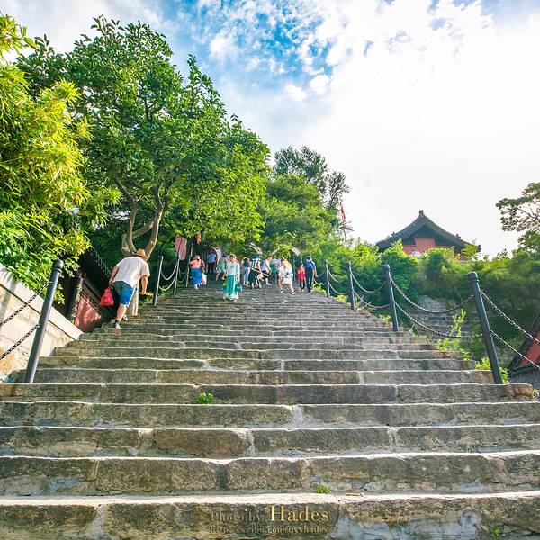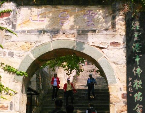 不要被高耸的台阶下住,其实只有这段不长的台阶需要爬,剩下的路段都较为平整,丝毫...在山门处游览一圈之后,坐上景区的旅游专线车向山上行进,在三元宫停靠站下车。从这里开始,便步入了花果山核心景区的地界。