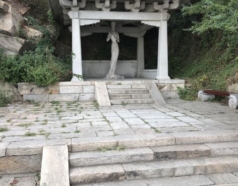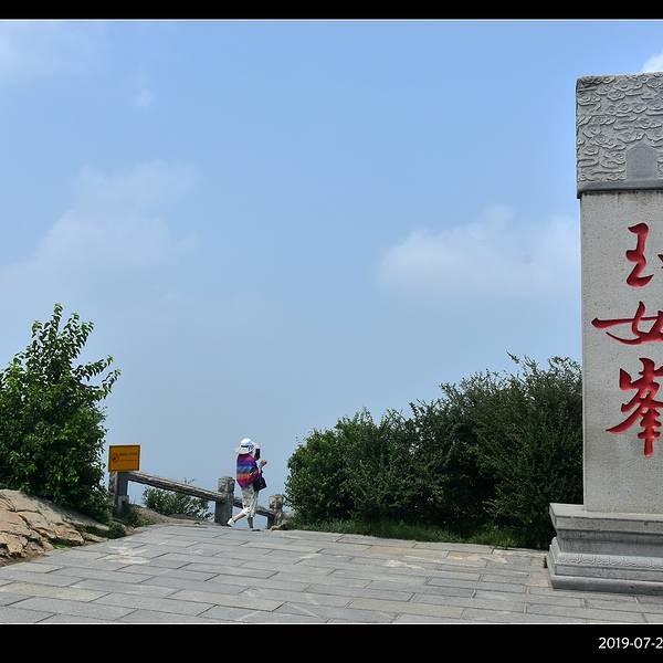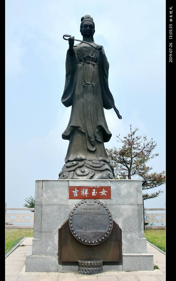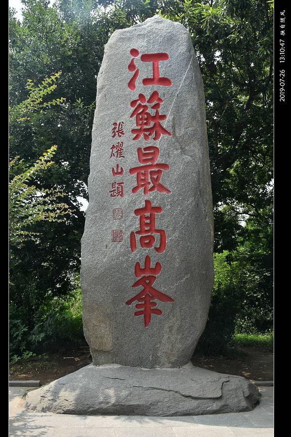 在这个停车场的大平台上的把角处立着一块大石碑,上写: 江苏 最高峰(估计 江苏 的山海拔都不高吧)。无论如何也有纪念意义,我赶紧过去留个影。后来我才想起,这...这雕像叫做“吉祥玉女”,面目表情细看很美丽。