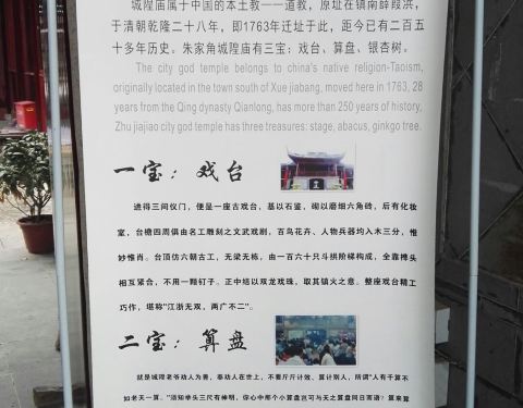 位于朱家角镇内,不大几分钟就逛了一圈,出门看到介绍,内有三宝古戏台,算盘,古银杏树,没注意算盘在哪,又返回走了一躺。城隍庙真心不错,保存维护的也挺好,值得看看。