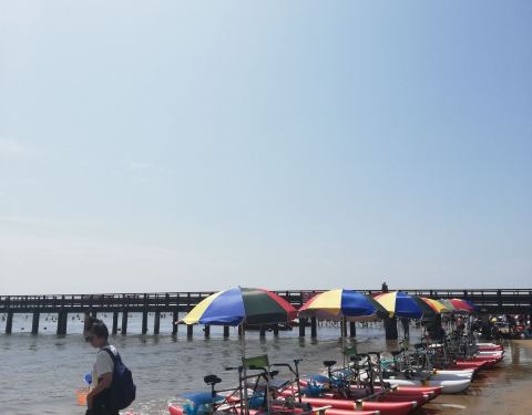 朋友说这里的海滩平缓,海水很浅,还可以赶海挖皮皮虾,所以特意去的这个浴场,不收费,但是其他收费都不低,比如买东西或者租躺椅~水的确不深,但是海水很浑浊,不是很喜欢~而且岸边很多海蜇,据说水里也有,孩子就不爱下水了~