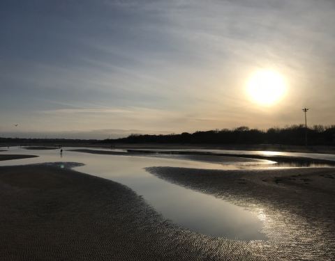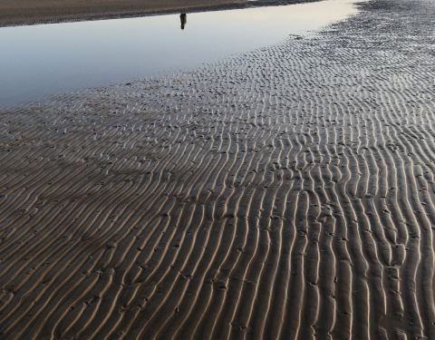 半个月前来过这里,成片的海鸥今天已不见踪影,但今天夕阳下更美,海水退潮露出大片沙滩,留下沙纹简直美翻了,岸边的海水开始结冰了