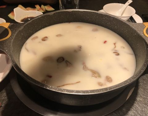 之前看网上评论很好只是每次来都排队 。上周去万象城不是周末就想着来尝尝 。用餐的点还是有人在等位 。等了大概十分钟左右 。内部环境还是不错挺宽敞 。桌子材质也挺独特 。点了经典的胡椒猪肚鸡锅 。还有牛羊肉 。豆皮 。蔬菜拼 。菌类拼 。龙利鱼 。蔬菜面 。汤很浓厚鲜美 。吃多了麻辣火锅偶尔吃这种锅底也感觉蛮养生的 。服务很值得一赞 。服务员们很赶眼色 。时常过来捞一下浮沫或者帮着做点什么 。两个人点的有些多最后撑的不行 。下次有经验就好了。