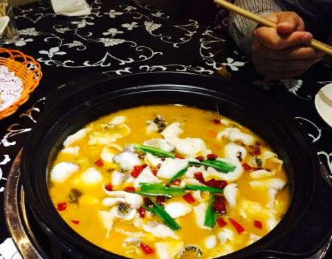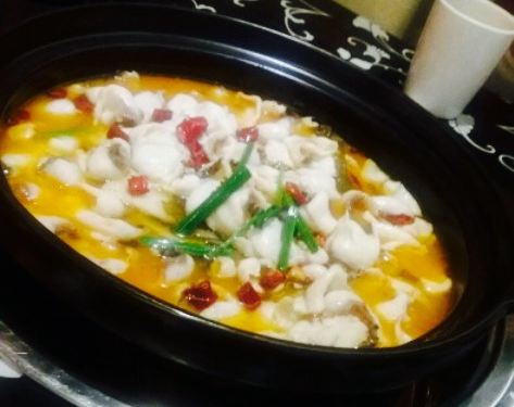 我们点的是微辣的,鱼大约是2,5斤,鱼锅里有萝卜,酸菜,还有粉条吧。也许是微辣的,觉得味道不是那么好吃吧。但是汤蛮好喝的,酸酸的的,并且感觉比较鲜,浓浓的。两个人,还点了生菜,冬瓜片,猪脑,豆腐皮。...