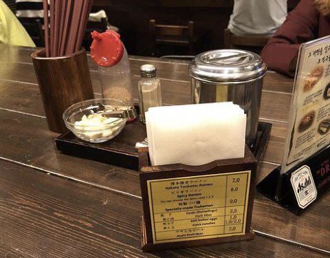 韩国的日式拉面店,环境不错,里面口味就是比较单一,感觉也比较友善,汤底很浓郁,里面放了很多配料,玉米,木耳丝,还可以放了半个溏心蛋,可以选择辣的口味,感觉辣味会很抢味,还是选择原味比较好,面条比较...韩国的日式拉面店,环境不错,里面口味就是比较单一,感觉也比较友善,汤底很浓郁,里面放了很多配料,玉米,木耳丝,还可以放了半个溏心蛋,可以选择辣的口味,感觉辣味会很抢味,还是选择原味比较好,面条比较有韧性,碗是挺大的,量比较少,有中文的服务,不需要太过担心,空间不大,价格不贵,可以去尝试一下。 2018-11-21 00:05来自携程 网友