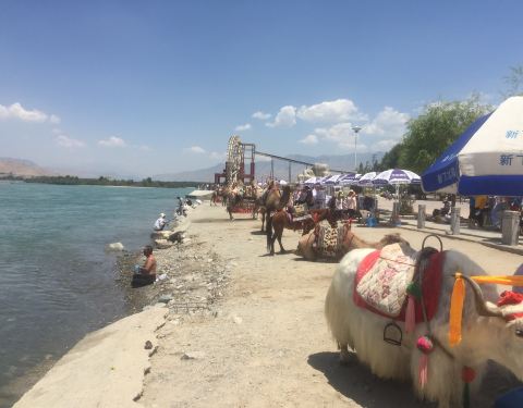 黄河广场就在黄河边上,依黄河而建,广场上有很多娱乐项目,坐花车、骑骆驼等等,来这里主要还是游览黄河的,黄河水碧蓝清澈,缓缓流淌,景色怡人,有人比喻贵德是西宁的后花园。广场一边还有条美食街非常引人注目,都是西北的各种小吃。现在的季节对西北地区来说正是春暖花开的时候,天气又特好,所以游人很多