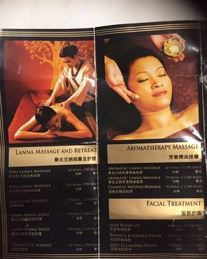 (不太热门,但环境不错,按摩技术也好),享受了2个小时的泰式按摩,我觉得十分放松,给我按的阿姨会说点中文和英文,我和她聊得很开心。包子却觉得力道不够,于是又约了这家店第二天的精油按摩。 从山上下来就赶去按摩先了。第一次选了“泰式经典按摩”,基本就是各种推拿,像做瑜伽的感觉。可能我比较受力,按完没啥感觉,不过朋友说挺舒服的。因为平时在国内按的都是精油,所以又预约了一个第二天的“精油按摩”,还是挺舒服的。服务态度很好,按完都给了100B小费。