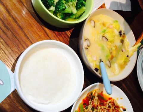 鱼香肉思,比较有特点,底下有萝卜丝,豆芽,芹菜,给了一份类似北京烤鸭的皮,包着吃。冷吃鲫鱼,皮很可口,不会很咸底部有点油腻。厨娘泡饭,很清淡,上面脆脆的那个很鲜美。蔬果汁,有豆浆,西红柿,猕猴桃,还有一个应该是芒果的。他家菜总体算清淡,装修很小清新。价钱也方便。