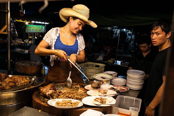 到这里来可以吃到地道泰式猪脚饭。凤飞飞猪脚饭据说是清迈最好吃的猪脚饭,人气很旺,位于清迈北城门昌卜克夜市,7-11便利店旁。大约晚上5点以后出摊,美女老板娘像”帽子歌后“凤飞飞一样天天戴着帽子,很容易辨认。