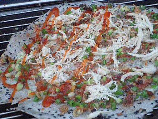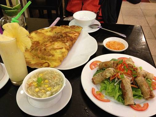 “越南比萨 ”原产于大嘞市,后来因为其独特的美味越来越受到食客们的追捧,逐渐把它引进了其他的城市。不同于平常所吃的比萨,越南比萨的皮并不是常见的面包,而是选用很薄的米纸,里面的成分也非常丰富:猪肉、牛肉、鸡肉、火腿、鱿鱼、鸡蛋、洋葱等等,应有尽有,和萝王子酱或辣椒酱一起吃,味道特别赞。在清凉的傍晚,品尝刚出炉的热乎乎的比萨,顿时可以感受到温暖,定会让人回味无穷。