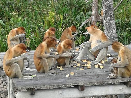 在沙巴的红树林里有数不清的珍稀动物,长相可爱的长鼻猴是其一,它们有着下垂的鼻子和巨大的身型,颜色橙白灰相间。这种可爱的动物喜欢群居,观看它们在树上跳跃十分有趣。长鼻猴喜欢在早上太阳升起前和傍晚时分到河岸的树上觅食,沿着一条蜿蜒的河流巡航,还有机会看见巨果蝠(一种吃水果和花蜜的蝙蝠),鳄鱼和萤火虫等。