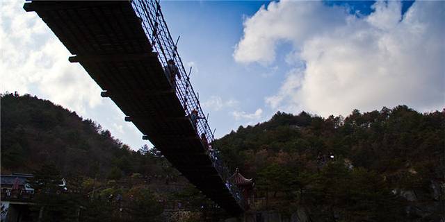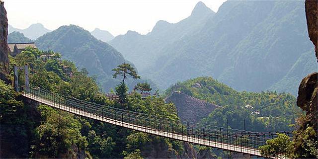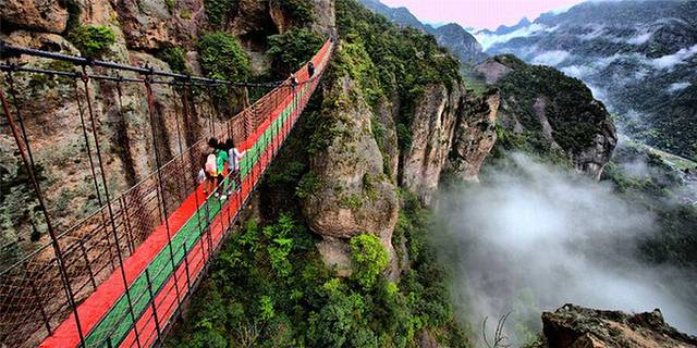 走完了云崖天廊还觉得意犹未尽?那就一定要试试位于同一景点的灵岩铁索桥啦。灵岩铁索桥“悬”在两座悬崖峭壁之间,桥长超过百米,桥下深不见底,游客行走于桥上时,桥身摇晃不定,胆小的旅客可能走到半路就腿软啦!当然,别光顾着低头走索桥啦,半空中的风景更美哦~