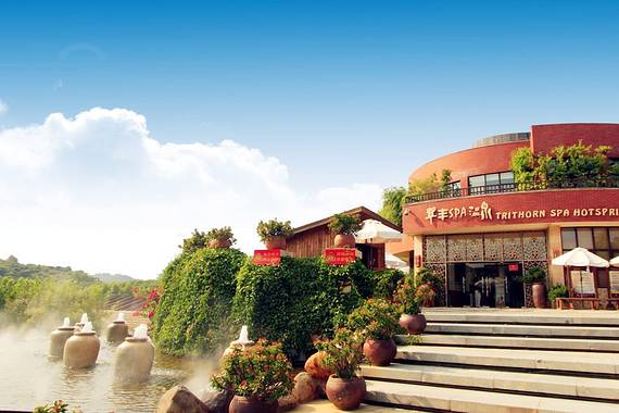 天沐温泉非常有趣,是坐落在一个小岛上的。先过一座跨海桥,才能到达这里。天沐温泉的池子大大小小加起来有六七十个,根据每个人的情况不同,可以选择各种温度的,除了水温不同,功效也不同,还有的池子有按摩作用,如果累了,还可以到水果饮料区,一边吃一边聊天,非常惬意。