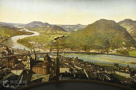 这个博物馆看起来并不明显,里面也不大。但博物馆里最大的亮点就是画家J.M. Sattler所绘的长26米,面积130平米的200多年前萨尔茨堡及城郊的环形画。在环形画前,参观者可以用望远镜仔细观察画上当时居民的生活细节。在这宁静的气氛中,仿佛能回到一百多年前,领略当时各国城市的面貌,颇为的有趣。