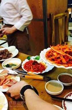 滨江道附近特别火爆的一个韩式烧烤,用的是炭火,目前不少烧烤为了省事都改用电的烧烤了,虽然可能油烟少了很多,但是烤肉还是要用炭火烤的最好吃!这家店送的小菜也比较多,辣白菜和南瓜粥味道最好。推荐猪五花肉,羊肉和鸡脆骨,五花肉烤完非常香,蘸着这家店自己配的辣酱,搭配生菜一起吃非常好吃,羊肉也是提前腌制过的,所以烤完味道很浓~喜爱韩国料理的朋友们一定要来尝一尝才不后悔~