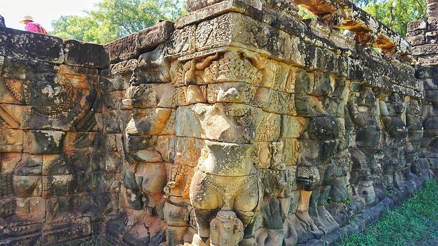 吴哥窟以建筑宏伟与浮雕细致闻名于世。这一整面墙上都是雕刻精细的图片,讲述柬埔寨的历史和神话故事。