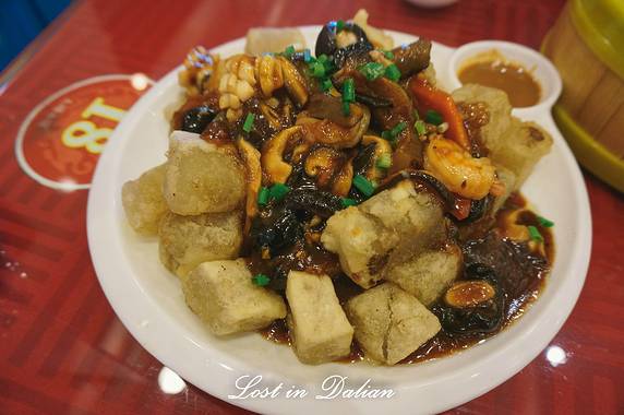 店内有各种各样的大连老菜和海鲜,推荐三鲜焖子,溜肝尖