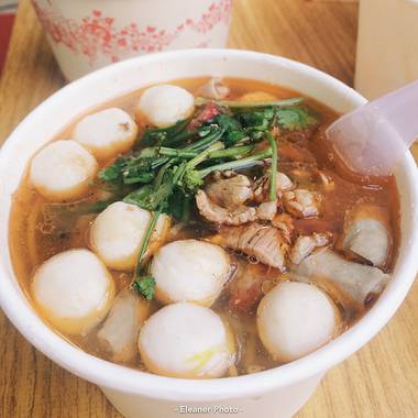 配料根据个人口味自由选择,种类很多,有弹弹的鱼丸、脆脆的鱿鱼、润滑的鸭血等