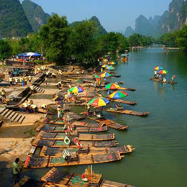 遇龙河是漓江在阳朔的支流,风景如画,堪称阳朔最美景点。游玩遇龙河可以步行、骑车或漂流,大多数人会选择坐竹筏在山间穿行,水质清澈见底,微微徐风,很是惬意。