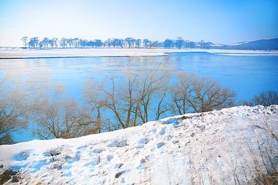 每到寒冬,不冻的江水中升腾的水雾遇冷,在树上凝结为霜花,从远处看正是传说中的玉树琼花,美不胜收。