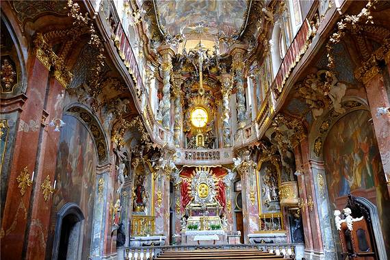 阿桑教堂建于1734年-1746年。教堂的左侧是教堂建造者之一——艾吉德·吉林·阿萨姆的住房。房屋外立面按照巴伐利亚传统风格绘制,下半部表现的是现实世界和人类的艺术活动,上半部则是天主教和上古历史的绘画。