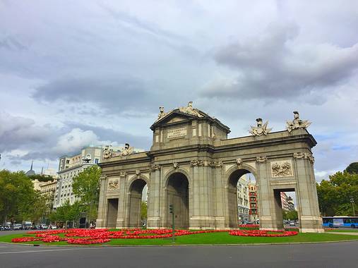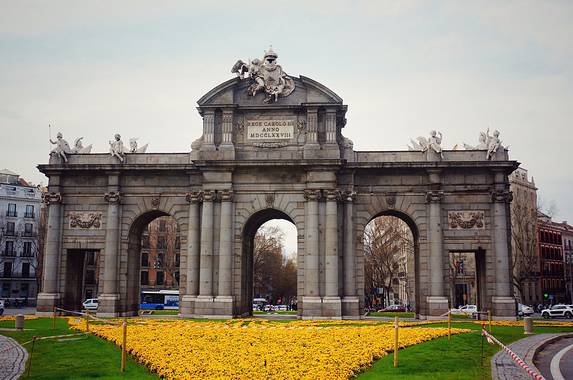 阿尔卡拉门靠近市中心,距离丽池公园的正门只有数米之遥,是马德里仅存的几个古老城门之一,采用大型罗马凯旋门的形式,是18世纪欧洲史无前例的建筑巨作。