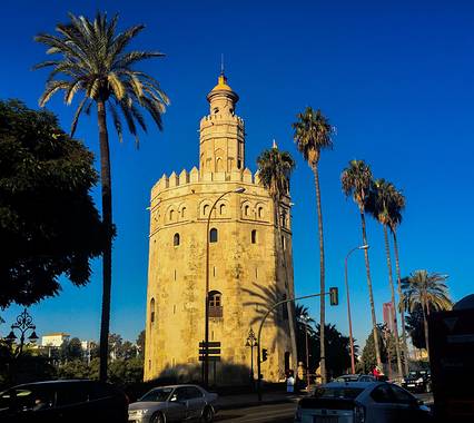 修建于13世纪的黄金塔(Torre del Oro)曾作为军事瞭望塔,传说在辉煌的航海时代,这里曾经是那些满载着黄金白银从美洲回来的船只的终点,存放了各种财宝,今日的黄金塔成为了海军博物馆,是塞维利亚辉煌的航海史的见证。