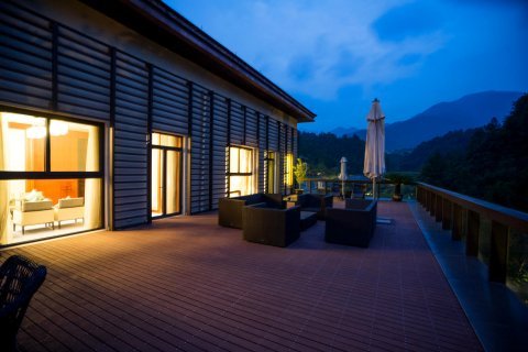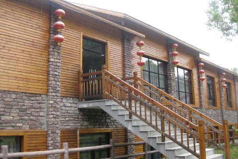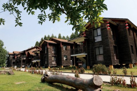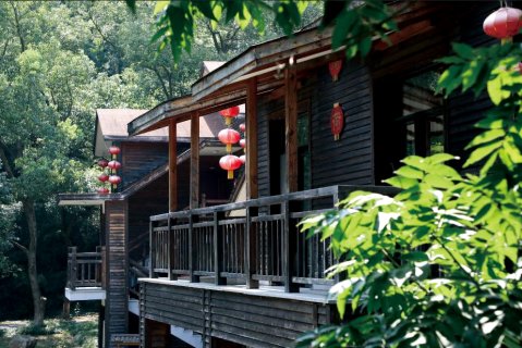 这家酒店与天目溪漂流景区相邻,距瑶琳仙境仅2公里。面前是分水江,背后是大山,环境一流。50余幢挂满红灯笼的小木屋古朴典雅,韵味十足。旺季游客多的时候,还可以在晚上参加风情篝火晚会,各种精彩的节目,乐趣无穷!