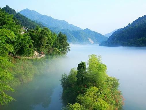 这里长年两岸峰峦叠翠,湖面水汽蒸腾,云雾缭绕,神秘绮丽,其雾时移时凝,宛如一条被仙女挥舞着的“白练”,美丽之极,堪称中华一绝。
