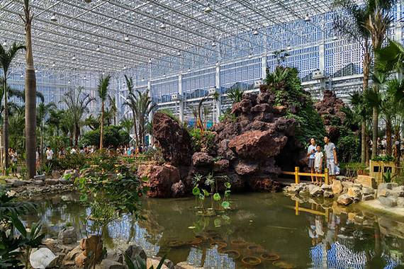 全园分为6区12园36景,由72座连桥把各景点连缀在一起,形成了以盛世莲花观音塑像为主题的巨型生态园林。