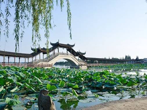 古莲桥是锦溪古镇的标志性建筑,整座桥独立在五保湖中央,朱红色,古典飞檐造型的亭子连结起长长的廊桥,桥亭在水中的倒影漂亮得很,每到夏季湖中荷花盛放,映衬得古莲桥更加美丽。