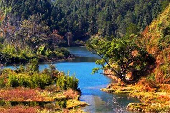 深渡水生态景区山清水蓝,枫红竹翠,景色迷人,具有“广东九寨沟”的美誉,是广东省十佳自驾车游旅游线路之一。
