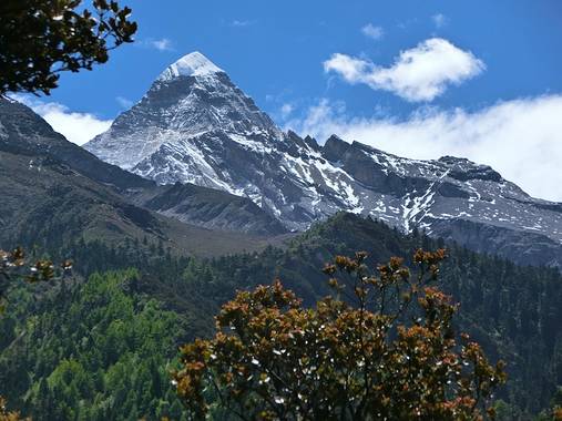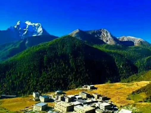 村子位于山间台地上,峡谷中出现这样的台地让人有种恍若隔世的感觉。四周是起伏着的苍凉群山,在蓝色天空映衬下,山峦的轮廓青黑晶亮。山谷的尽头,巍峨的仙乃日雪峰毫无保留地沐浴在阳光之下,简练而险峻,像寥寥几笔勾勒出的简笔画。