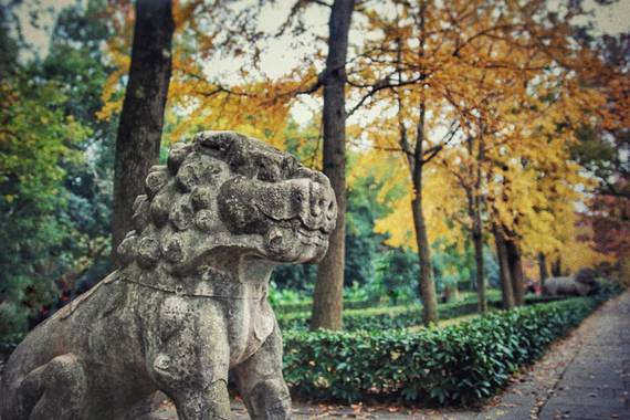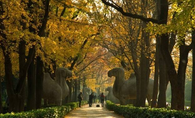 深秋时节,五彩斑斓,光影摩挲,石人石兽站卧其中,诉说着历史的沧桑