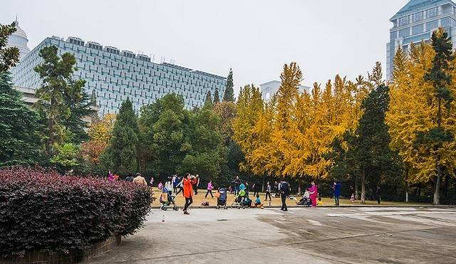有两排银杏树,一排在小草坪旁的林阴路上,另一片在东边围墙附近