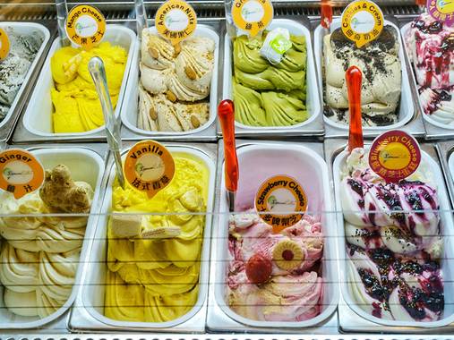 店内的冰淇淋口味多种多样,柠檬、芒果等等这些水果口味自不必说,还有一些特别的口味,比如益力多、彩虹等等,非常有创意
