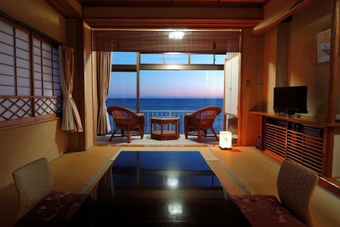 酒店可俯瞰Sagami-nada海,房间很大,海景阳台可尽情赏海,还配有传统的日式蒲团。可以免费预约温泉浴场供私人使用,天气温暖时,酒店开放室外温泉。