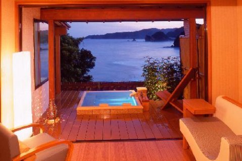 旅馆位于东伊豆町,从房间可以眺望一望无际的大海,边泡温泉边欣赏海景是非凡的享受。晚餐和早餐很丰富,食材很新鲜;晚上有免费香槟巧克力,早上日出后至8点前有免费咖啡,下午还有免费的小食品和黑豆茶;还可以预约spa和禅修。